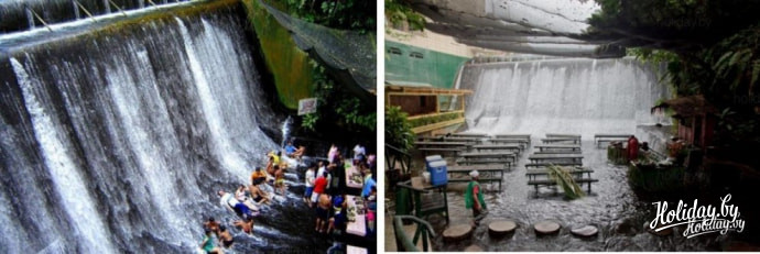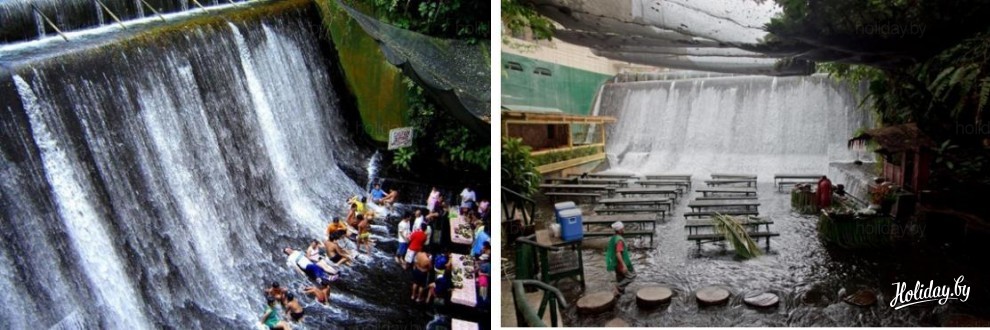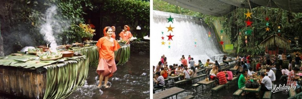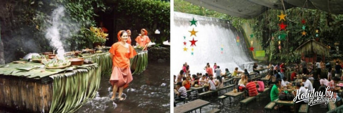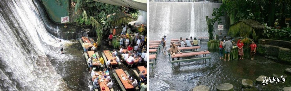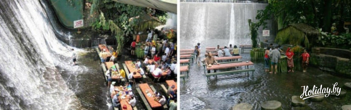И без того нестандартный экзотический отдых на Филиппинских островах может стать еще более оригинальным, если поехать на курорт Villa Escudero, что в провинции Кесон, главной его особенностью по праву считаются не пляжи и отели с экзотическими номерами, а ресторан Villa Escudero, расположенный прям у подножья настоящего водопада. И как бы обычно то стоит держаться подальше от подножий водопадов, но в данном случае он небольшой, поэтому работники ресторана даже призывают подойти поближе, снять обувь и отдохнуть у воды.