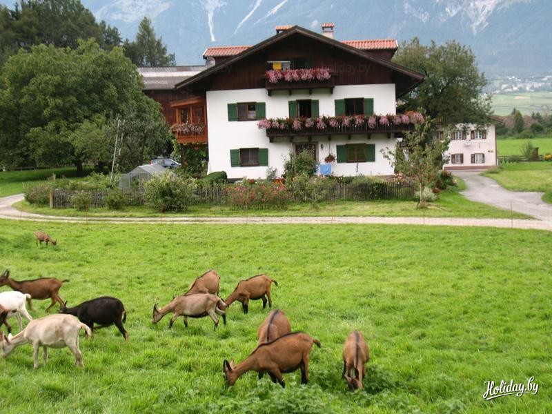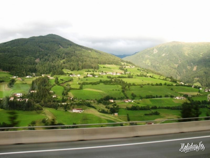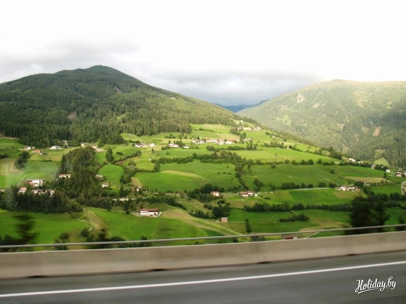 Ну а у нас впереди Италия. Вот уже замелькали за окном автобуса альпийские пейзажи с маленькими деревушками