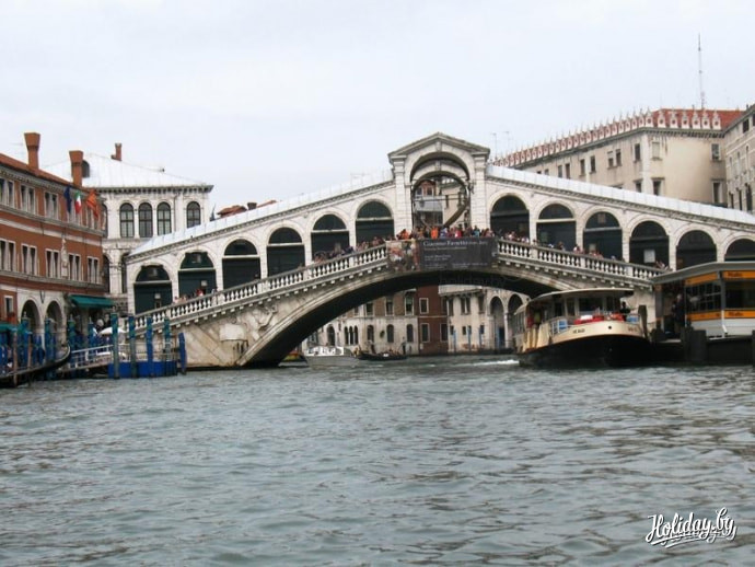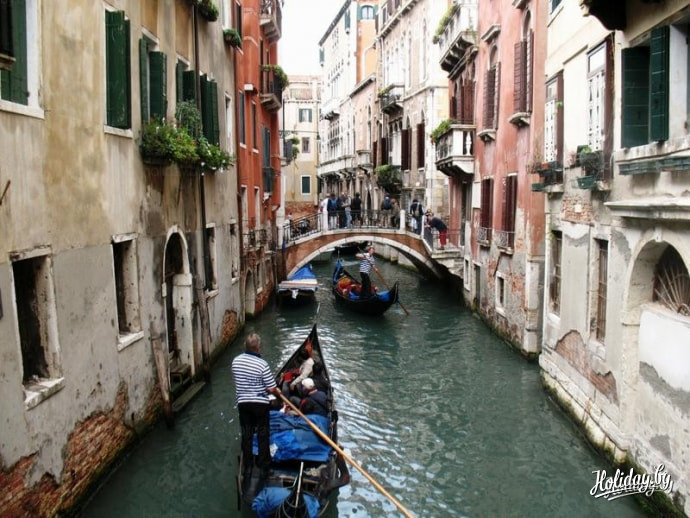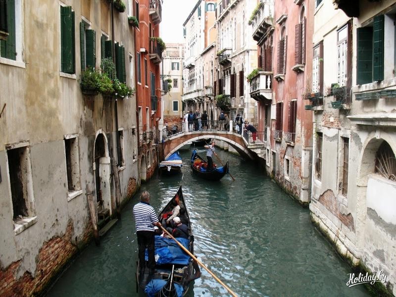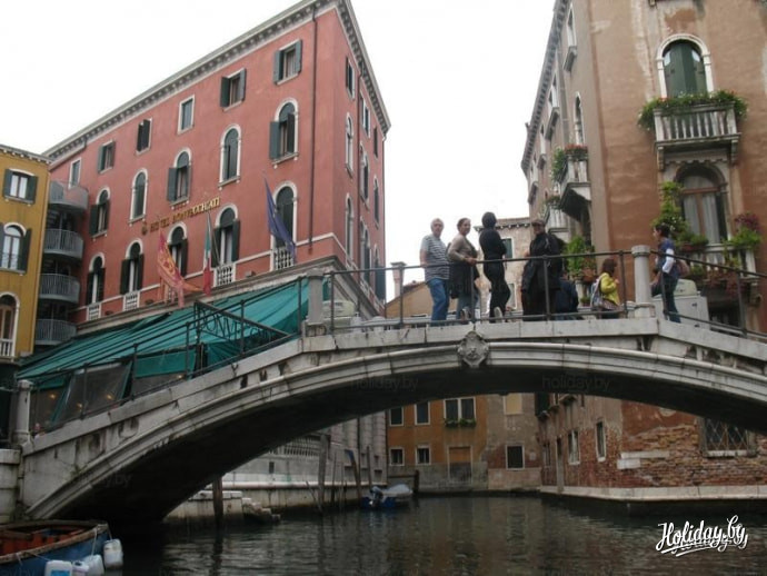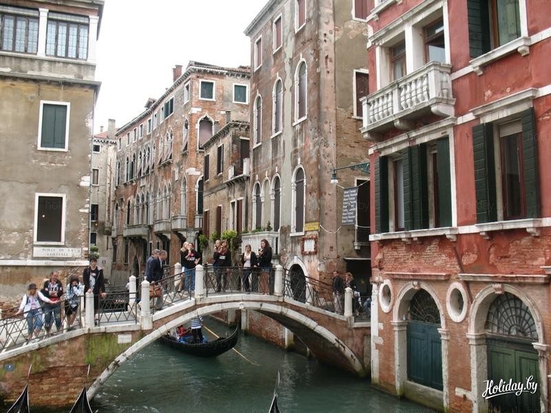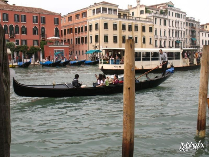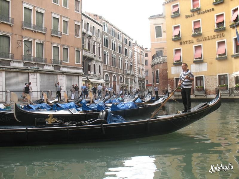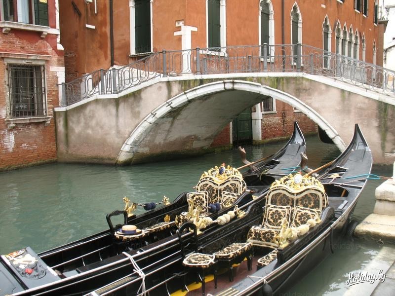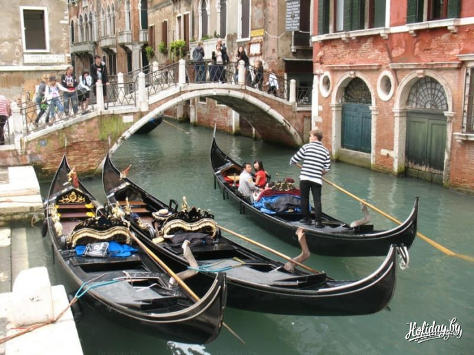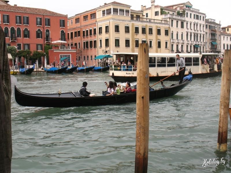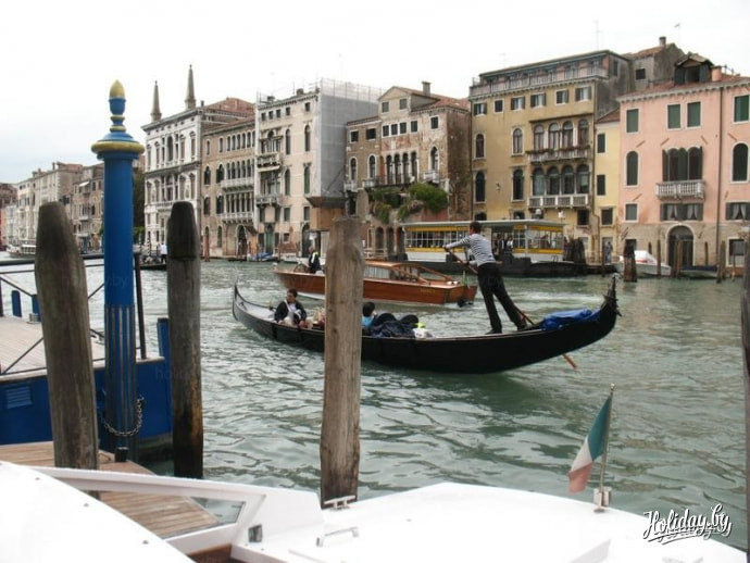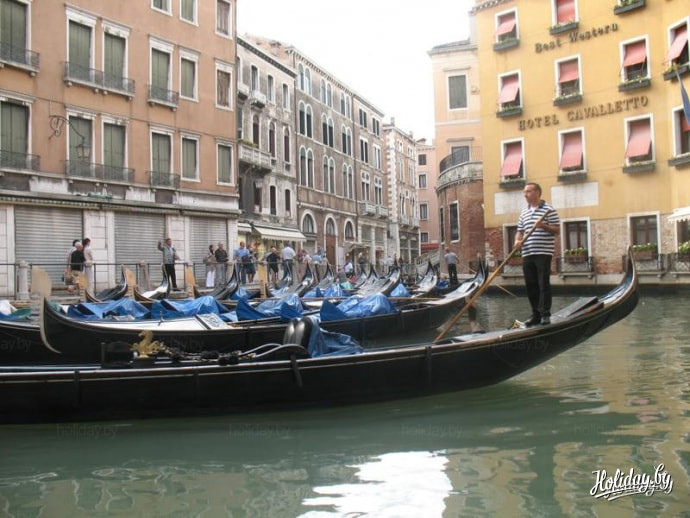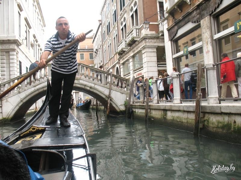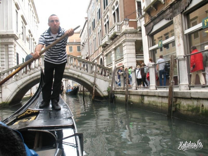 Быть в Венеции и не прокатиться по ее каналам в гондоле просто непростительно. И хотя удовольствие это не из дешевых - 20 евро с человека, оно того стоит. Ведь город построен с тем расчетом, что рассматривать его будут именно с воды. В гондолу помещается 5 человек и сопровождающий еще при подъезде к Венеции постарается подобрать группы по 5 человек. Поэтому постарайтесь заранее найти себе компанию. Будет очень обидно, если именно вам не найдется попутчик. Гондола сродни дорогому автомобилю - ее стоимость начинается от 40 тысяч евро и она делается под конкретного человека, настраивается под его вес. Металлическая фигура на носу гондолы не только украшение - это противовес. Поэтому гондольер не может позволить себе вдруг растолстеть.