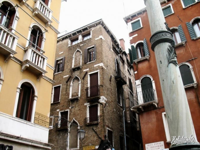 Эти указатели будут указывать вам путь, как ниточка Ариадны. Улицы в Венеции практически все узкие и кривые. К тому же некоторые заканчиваются обрывистым выходом в канал. Заграждений часто нет. Не пытайтесь сориентироваться по номерам домов - запутаетесь еще больше. Знаете как венецианцы нумеруют дома? Я вам сейчас расскажу. Нумерация домов идет не в пределах улицы, а в пределах сестьере - так называются в Венеции районы. Их всего 6. Где-нибудь в центре такого сестьере выбирается дом, который будет номер 1, а вся остальная нумерация идет по спирали. Одна улица заканчивается, начинается другая, а нумерация все продолжается. Так, например, если последний номер был 525, то вам повезет если 526 окажется на следующей улице вон за тем мостиком, а может и не окажется. В середине прошлого века было решено упорядочить номера домов и все римские цифры заменить на арабские. Но в результате запутались еще больше. Даже сами венецианцы, объясняя адрес, стараются давать какие-либо общеизвестные координаты. Тем более, что таких мест хватает.