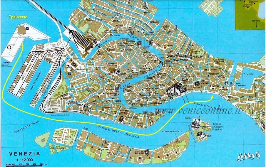 Но всему свое время. Как всем известно, Венеция город морской и расположен на островах, где просто нет места для туристических автобусов. Поэтому путь в город лежит через Транкетто - что-то вроде морского вокзала. Въезд и стоянка на Транкетто не дешев - для автобуса (и для вас соответственно) он обходится по 10 евро с каждого человека. Дальше вас повезет кораблик (стоимость - 15 евро в оба конца) вот по этому маршруту.