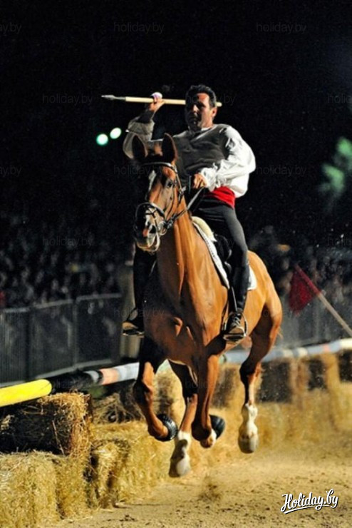 А состязание заключается в следующем. Всадники на лошадях, разогнавшись кидают копья на точность в изображение сарацина.