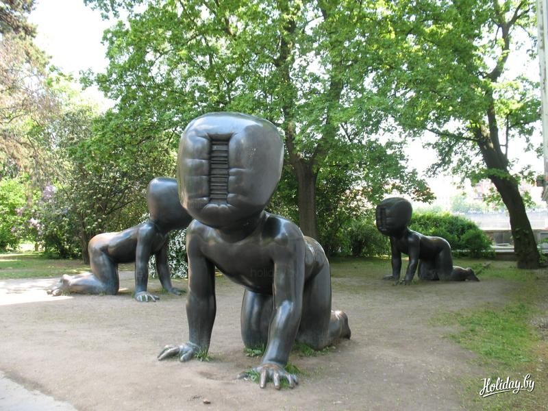 Это творения Давида Черного - Европейского церетели. Если внимательно присмотритесь, то таких же младенцев вы увидите на Пражской телебашне в Жижкове. Там они ползают прямо по самой телебашне. Писающие мужчины недалеко от пражского града - тоже его творение.