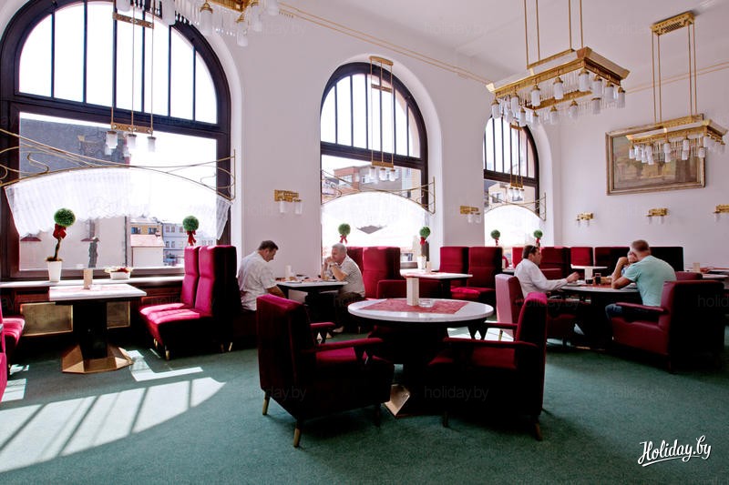 Интерьер отеля выполнен в стиле модерн эпохи 20 - 30 годов. Кроме гостиницы, ресторана и кафе, в отеле также находится муниципальный театр, в котором регулярно проходят наиболее важные события местной культурной жизни. Не примите это как рекламу - отель действительно очень достойный. Завтрак был обильным и очень вкусным, особенно после утренней прогулки к замку. Да и интерьер тому способствовал (фото с сайта отеля)