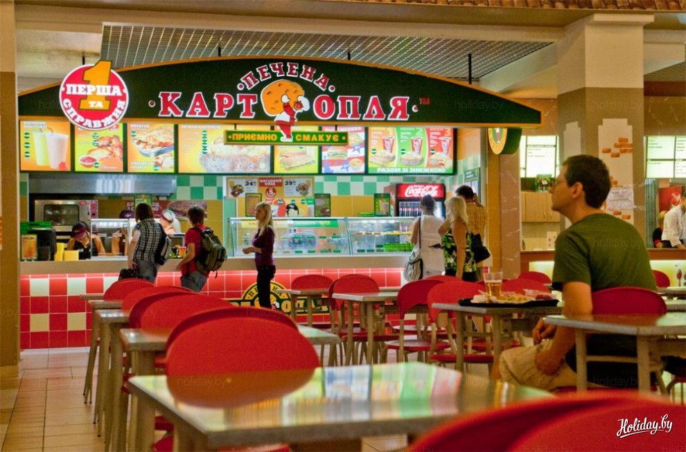 Кстати, возвращаясь к теме еды, здесь же, во втором блоке на втором этаже находится чудесный украинский фаст фуд «Печена Картопля». Огромных размеров картошку в мундире запекают в фольге, потом делают внутри пюре с различными салатными начинками. Очень вкусно и очень дешево (около 20,000 Br)