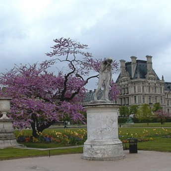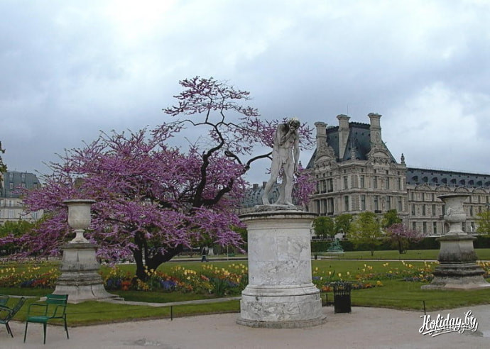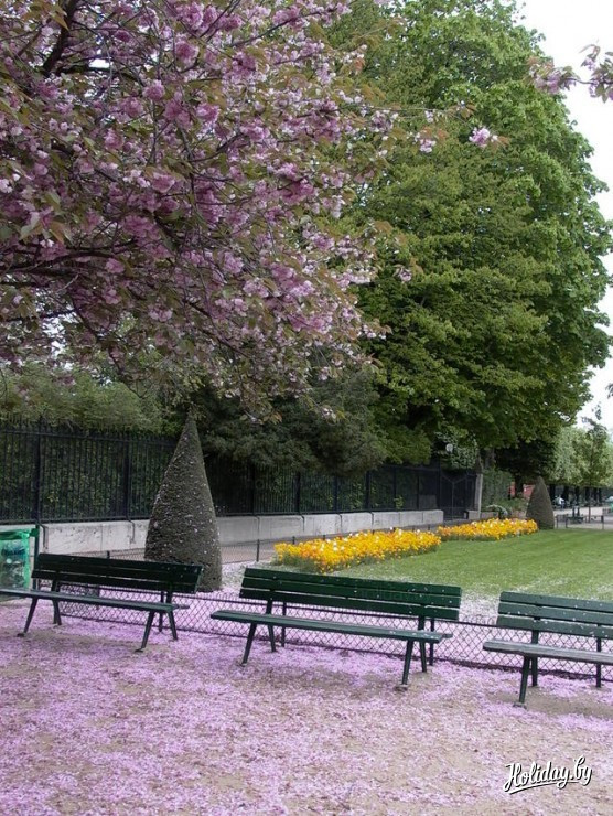 Пообедав в бистро на улице Риволи, мы отправились в полюбившийся нам сад Тюильри. Здесь, несмотря на непогоду, уже вовсю цвели разнообразные тюльпаны и сакура. Нам посчастливилось попасть в Париж в самый пик цветения сакуры. Посмотрев на то, как украшают центр Парижа эти лепестки, опадающие на тротуары, становится понятно, почему для японцев этот момент стал почти священным и привлекает тысячи туристов со всего мира.