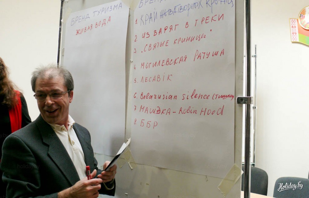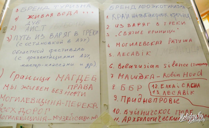 Во второй части «круглого стола» участники перешли к практике. Всем было роздано по два листка, на которых участникам предлагалось написать свое видение образа для бренда туризма и бренда агротуризма. Так как в процессе обсуждения из зала часто слышалось, что Могилёвской области сложно, потому что здесь нефти нет, то единственная ассоциация с регионом четко сформировавшаяся у меня в голове за время официальной части «круглого стола» была, естественно, «Мы живем без нефти!». По-моему, отличная перспектива развития экологического туризма в Могилевской области с таким имиджем :) Почему бы не превратить наш главный минус в жирный плюс! Забегая вперед скажу, что идею мою не поддержали и в «финал» она не вышла. Так что продам недорого;) Но вернемся к сути встречи.