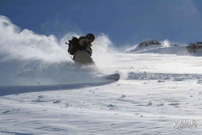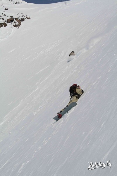 Пониже стало слаще, появился мягкий снег, доски перестали быть ледяными. У всех в глазах возникли искры, и организм стал выделять больше слюней! Фраза гида «А теперь до вертолета без остановок!» забила большой жирный гвоздь. Включаем вторую передачу! Скорость и ветер, заглушающий крик радости! Общая эйфория захватывает. Дуга, еще дуга. Из-под борда вырывается поднятая целина. Скорость позволяет практически ложится на склон. Свобода. Свобода движений, свобода скольжения. Никаких правил, тебя ограничивают только законы физики и здравого смысла. Немного переносишь вес вперед, дуга, и ты улетаешь влево, теперь ложишься на спину и улетаешь вправо. Человек раз попробовавши вкус ветра и свободы, никогда не сможет этого забыть! Сегодня мы все прикоснулись к мечте!