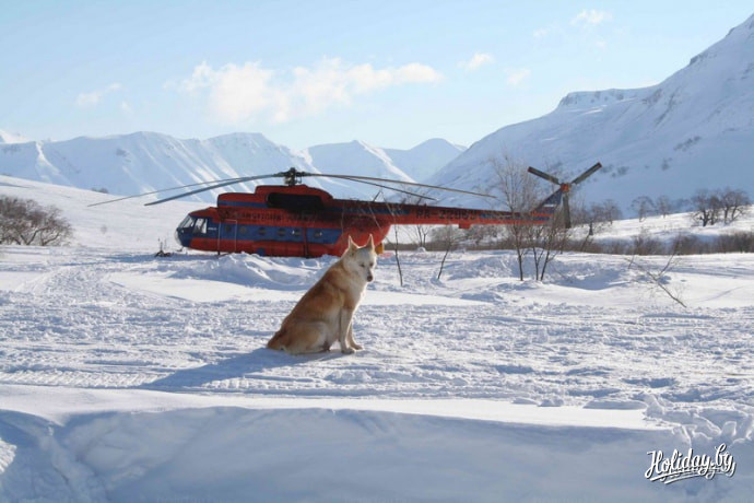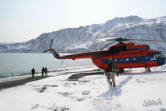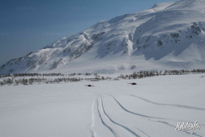 После 30 минутного перелета тень нашего вертолета начала увеличиваться и как хищник, прыгая по сопкам, подкрадываться к нам. Нас ожидали посадка и первые ощущения. Открылась дверь вертолета, и взорам предстал наш новый дом на ближайшие 10 дней. Неподалеку виднелись столпившиеся домики и Вася К гонимый восторгом и пивом к ним, по ходу напевая «Раз, два, три, четыре, пять - туалет, бегу тебя искать!!!». Под подошвами наших ботинок лежала Камчатская земля, покрытая 4-5 метрами снега. А перед нами база, зажатая по сторонам сопками. Она находилась в долине, и стояла на речушке, которая начиналась где-то под нами. Радовал пар стоящий над речкой. Это говорило о том, что прорвало трубу с отоплением или рядом где-то есть термальный источник. В любом раскладе горячая вода здесь есть.