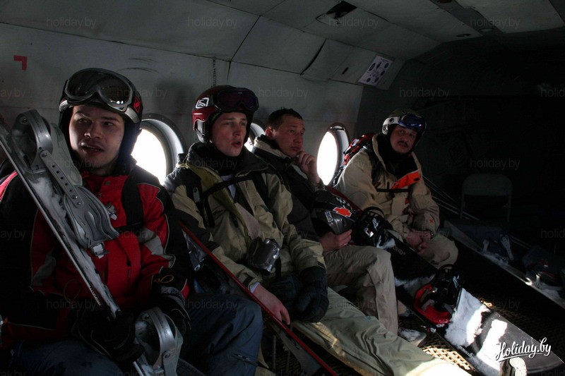 Солнце еще высоко, погода, настроение и разгруженный вертолет располагает к совершению первых спусков. Балки еще не избавились от предыдущих туристов, поэтому переодеваемся в местном клубе. Доски расчехлены, крепления прикручены. Легкий обед в нас, а мы в вертолете. Гул винтов приводит всех в экстаз. Наш гид Виталик советует вкататься и сделать пару несложных спусков. Мы соглашаемся, после чего он перетирает о чем-то с командиром нашего вертолета, которого тоже зовут Андреем (т.е. на имя Андрей откликалось большая часть команды, а по завершению экспедиции почти вся).