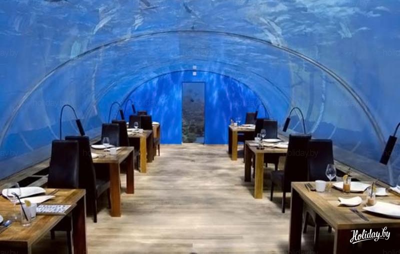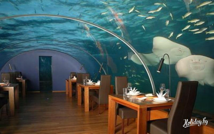 Купить тур на Мальдивы стоит всем тем, кто хочет получить первоклассный отдых. И без того чудестный пассивный отдых среди неописуемых красот можно разнообразить ужином в ресторане, который расположен под водой. Находится ресторан на острове Рангали (Rangali), и вмещает всего 12 человек. А на самом деле, скорее всего, там будете вы да еще пара человек, так как удовольствие не из дешевых. Хоть меню включает в себя внушительный перечень блюд, приезжают сюда не за едой, а впечатлениями и фотографиями. Побывав там вы точно переплюнете всех друзей, когда будете обмениваться рассказами из поездок. Но главное, этот ужин вы не забудете никогда.