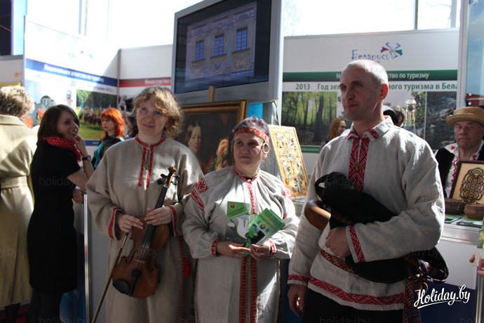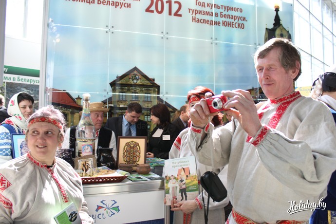 И презентация музеев выдалась действительно красочной и интересной. Да что там говорить, на выставке «Отдых – 2012» по креативности и подготовке музеи превосходили многих участников выставки. Здесь были и девушки в народных костюмах, и лотерея высказываний известных белорусов, и забавный петушок из "Музея истории театральной и музыкальной культуры Беларуси". Пара в синих бархатных костюмах 18 века представляла Мирский замок. А музей Максима Богдановича – если не сам Богданович, то человек, удачно его сыгравший.