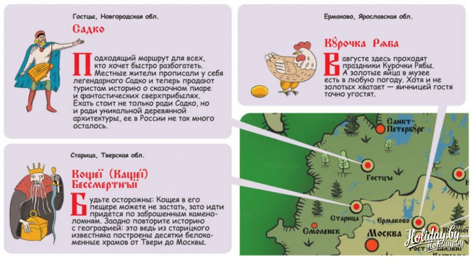 Отдых в России благодаря социальному проекту «Сказочная карта России» приобретает новые возможности для семейного путешествия. Добрая и такая трепетно- детская идея Алексея Козловского создать карту мест жительства волшебных героев нашла отклик у большинства российских городов, и уже 4 ноября из Москвы стартует первый маршрут по «Сказочному кольцу России».