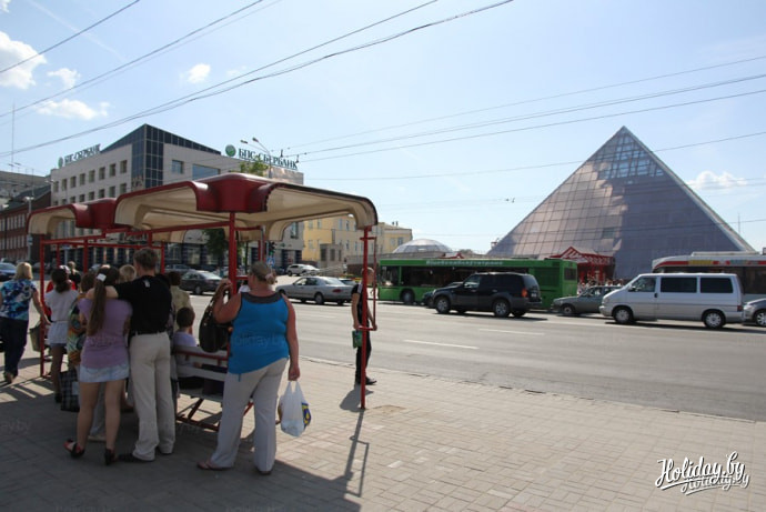 Жители Витебска ожидают автобуса на фоне главной Витебской пирамиды