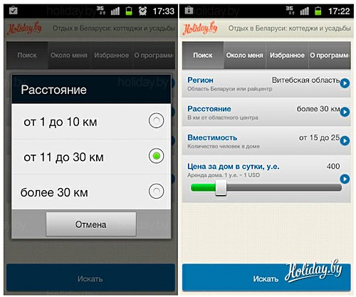 Туристический портал Беларуси Holiday.by представляет первое мобильное приложение для поиска вариантов загородного отдыха в Беларуси. Теперь чтобы быстро найти усадьбу, коттедж или загородный комплекс в Беларуси, узнать цену и проложить маршрут достаточно скачать бесплатное приложение для смартфона на базе Android.