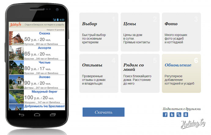 С 2006 года на Holiday.by работает каталог усадеб и коттеджей для отдыха в Беларуси. Появление мобильного приложения – это следующий шаг в развитии проекта. У туристов появляется помощник по организации загородного отдыха в Беларуси.
