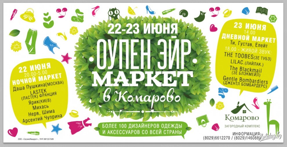 Очень советуем и сами поедем на событие №1 этих выходных – Оупэн Эйр Маркет в Комарово. С 8 вечера пятницы открывается первый ночной рынок от белорусских дизайнеров, шоппинг пройдет под сеты ди-джеев. В субботу в 2 часа дня маркет продолжает свою работу, до 6 вечера можно снова продолжать совершать покупки, а еще послушать замечательных людей The Toobes, LILAC, The Blackmail, The Fantastiques, Gentle Bombardiers. Цена одного дня посещения Оупэн Эйр Маркет - 30 тыс рублей.