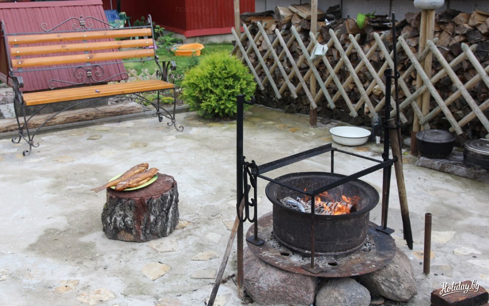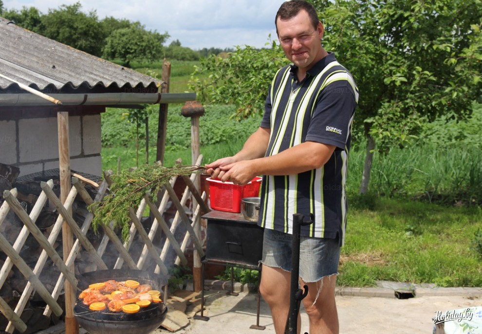 Еще Holiday.by попал в рай для гурманов, нас ожидал копченый судак в исполнении Владимира Борисовича. Как ни странно, но девушки съели в разы больше наших мужчин, а потом был специальный шашлык по рецепту Holiday.by - состав: шашлык из магазина, апельсины из магазина, барбекю и обязательно это все нужно обмахивать можжевеловой веточкой. ОООЧЕНЬ ВКУСНО, особенно со свежей зеленью из грядки!