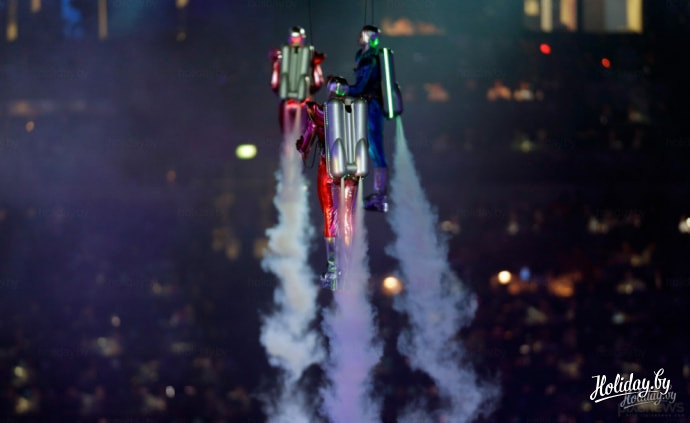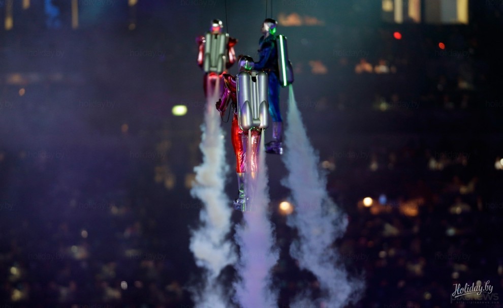 Актеры на реактивных ранцах взмывают к куполу олимпийского стадиона (AP Photo/Eric Gay)