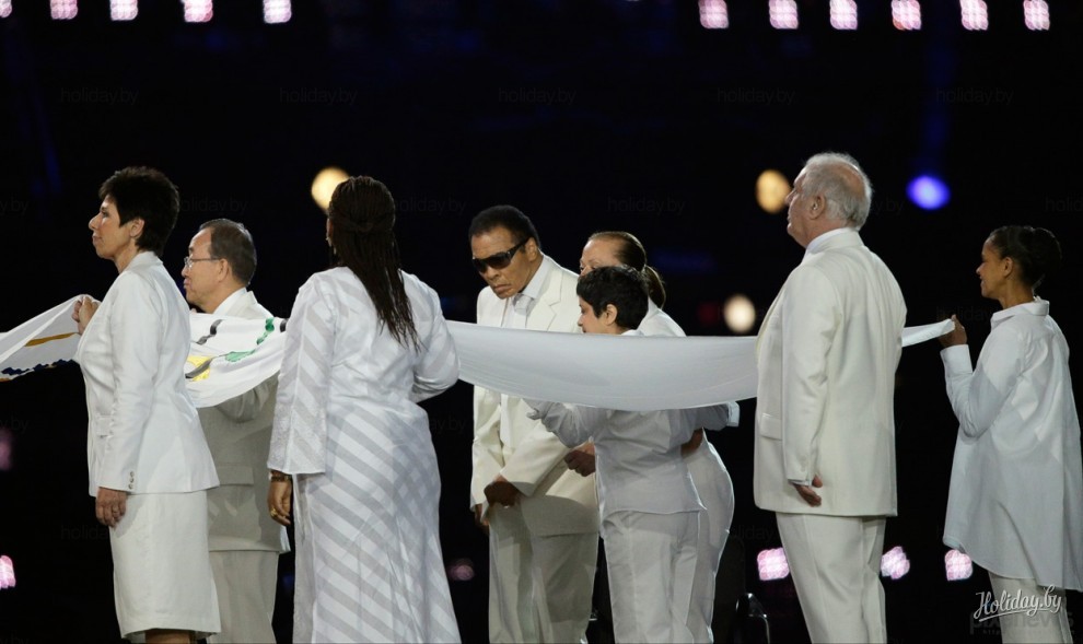 Известный боксер Мохаммед Али, несмотря на болезнь, принял участие в церемонии появления на стадионе олимпийского флага (AP Photo/Matt Slocum)