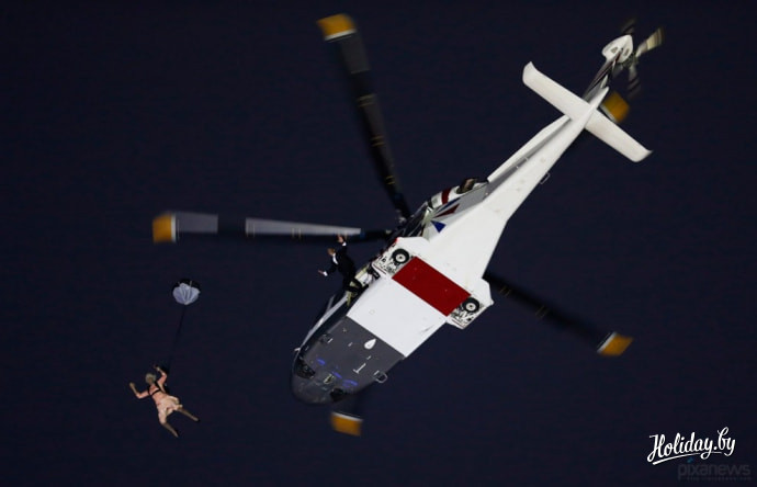 Перед тем как на церемонии появилась Елизавета II, королева Великобритании, в небе появился вертолет с актерами, сыгравшими роль королевы и агента 007, Джеймса Бонда (Reuters/Murad Sezer)