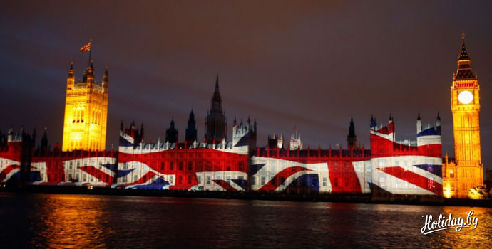 Флаги Великобритании, известные также как Юнион Джек, проецируются на Вестминстерский дворец возле Биг-Бена на берегу реки Темза во время открытия Олимпийских игр (Reuters/Sergio Perez)