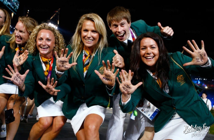 Весёлые члены делегации Австралии позируют перед фотокамерами. На их руках написаны разные надписи вроде "Привет, мама!" (Reuters/Kai Pfaffenbach)