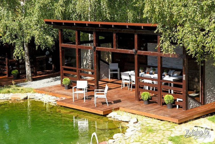 Территория коттеджа полностью соответствует элегантному дому! Здесь есть прекрасная беседка, где можно насладиться вкуснейшими блюдами, которые приготовлены на гриле, а принять солнечные ванны можно на шезлонге у чистого пруда.