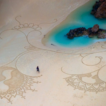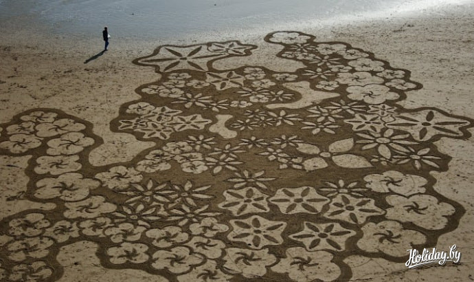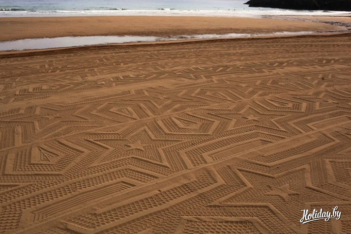 Каждый массивный рисунок создается всего за два часа. Исчезают он очень быстро, после первого прилива от работы ни остается и следа. В идеале, художник мечтает украсить своей работой какую-нибудь огромную безжизненную пустыню.
