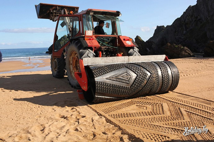 Испанская художница Гунилла Клинберг, то ли вдохновившись работами Адреаса, то ли просто решив украсить песчаные пляжи, пошла еще дальше. Зачем грабли, если есть техника! Она придумала, сделала и установила на пляжный трактор, который ровняет песок, специальное резиновое полотно с тиснением.