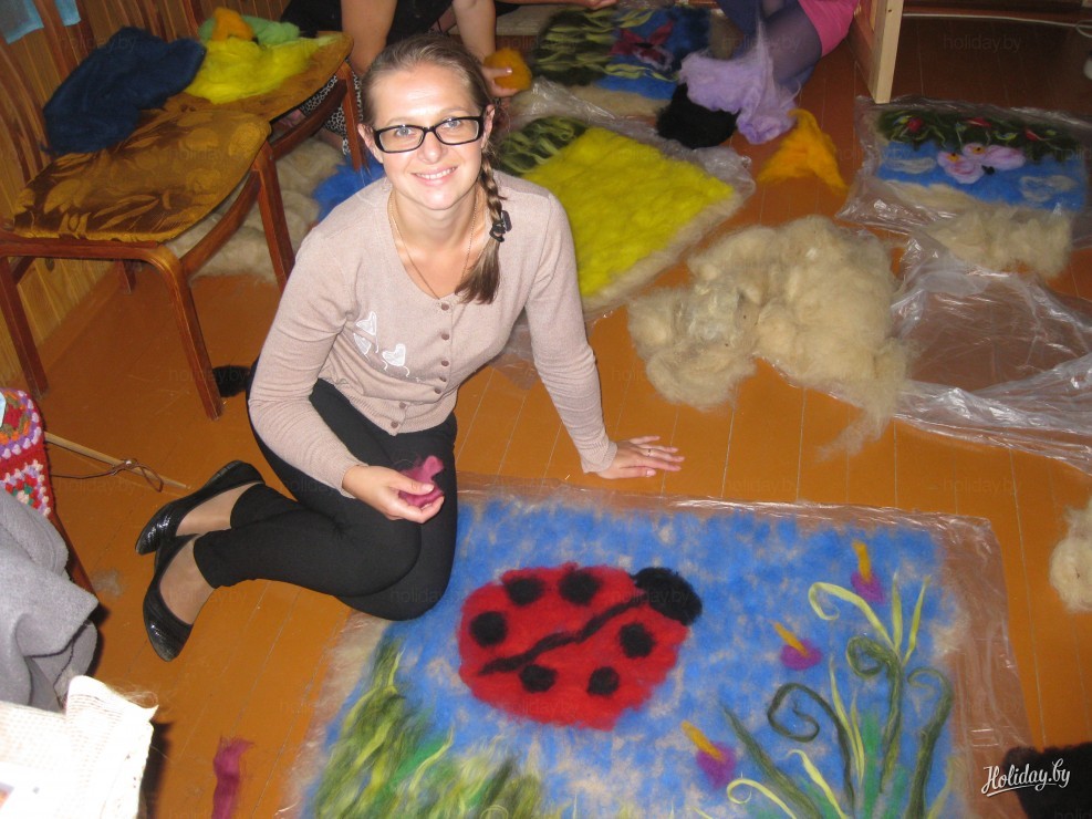 Последующие дни будет идти плодотворная работа на свежем воздухе, благо погода радует солнышком. Предстоит свалять множество красивых и главное полезных изделий: шапочки, береты, тапочки, сумочки и т.д. Эксперты по валянию, две Наташи (одна из Витебска, другая из Минска) не дадут сидеть без дела.
