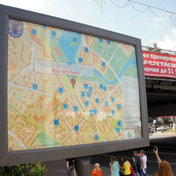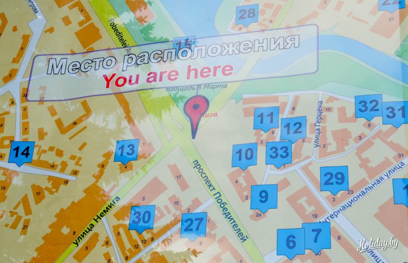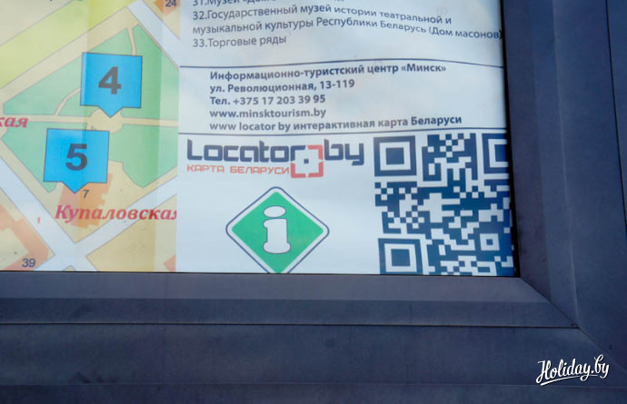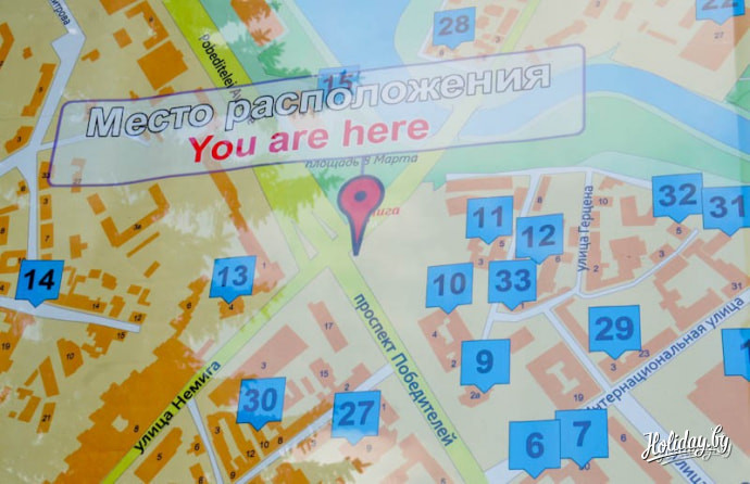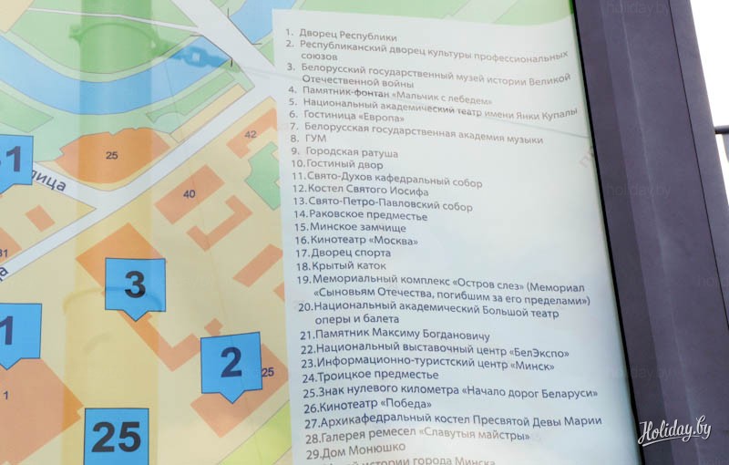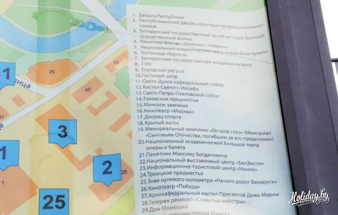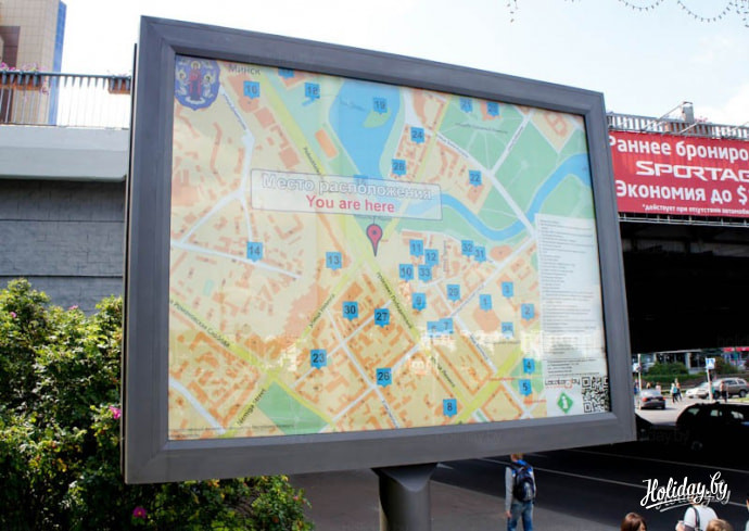 С помощью такой карты города каждый турист может узнать свое текущее месторасположение и проложить маршрут к достопримечательностям Минска. На билболдах также есть свой список объектов, рекомендуемых к посещению.