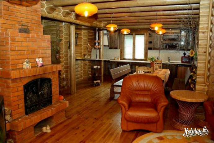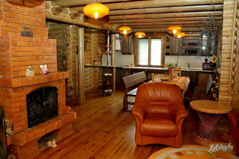 В доме 4 комнаты, спальни расположены на мансарде, а большой холл совмещен с гостиной и столовой. Вся сантехника в доме испанская, а мебель сделана из натурального дерева, в славянском стиле. Также здесь есть баня, камин, бильярдная и настольный теннис.
