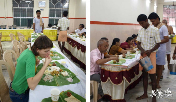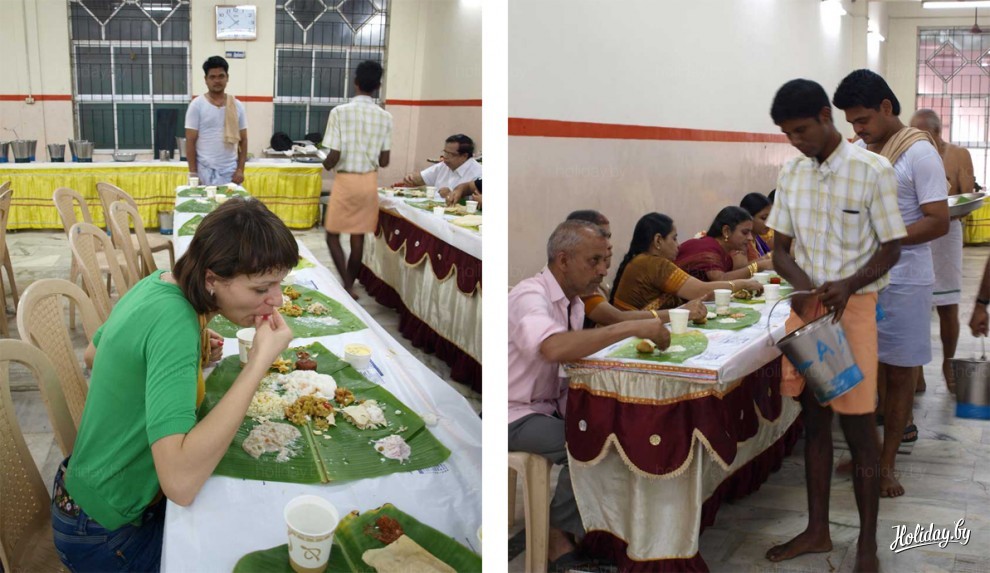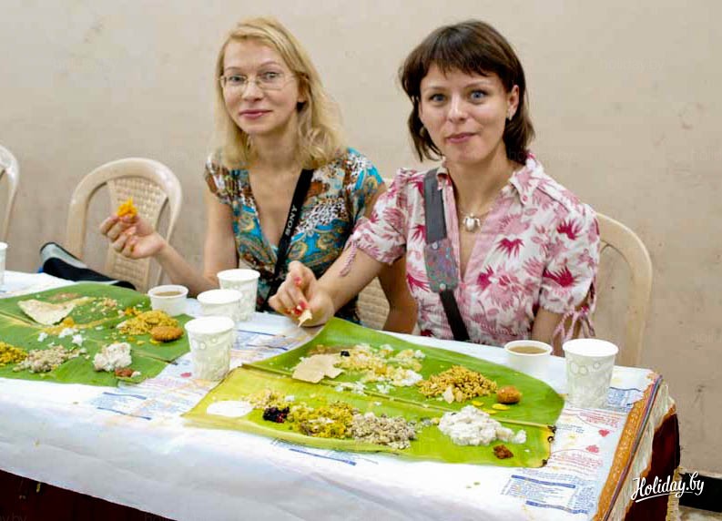 Перед нами развернули банановые листы (конечно, грязные, а что бы их очистить, достаточно «сбрызнуть водой и смахнуть своей же рукой эти капли»). Слуги в набедренных повязках, едва прикрывающих наготу загорелых южно-индийских тел, из ведер черпаками или ложками стали наваливать на этот лист кучками разную еду.