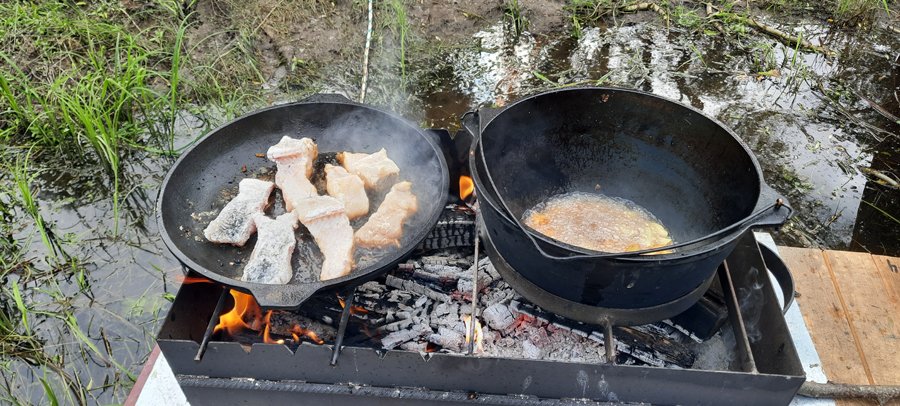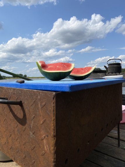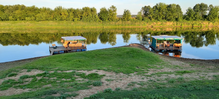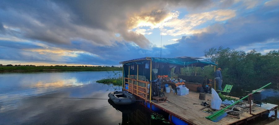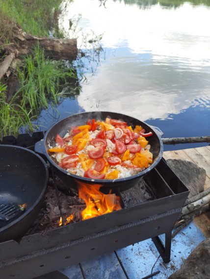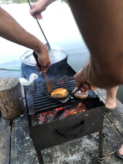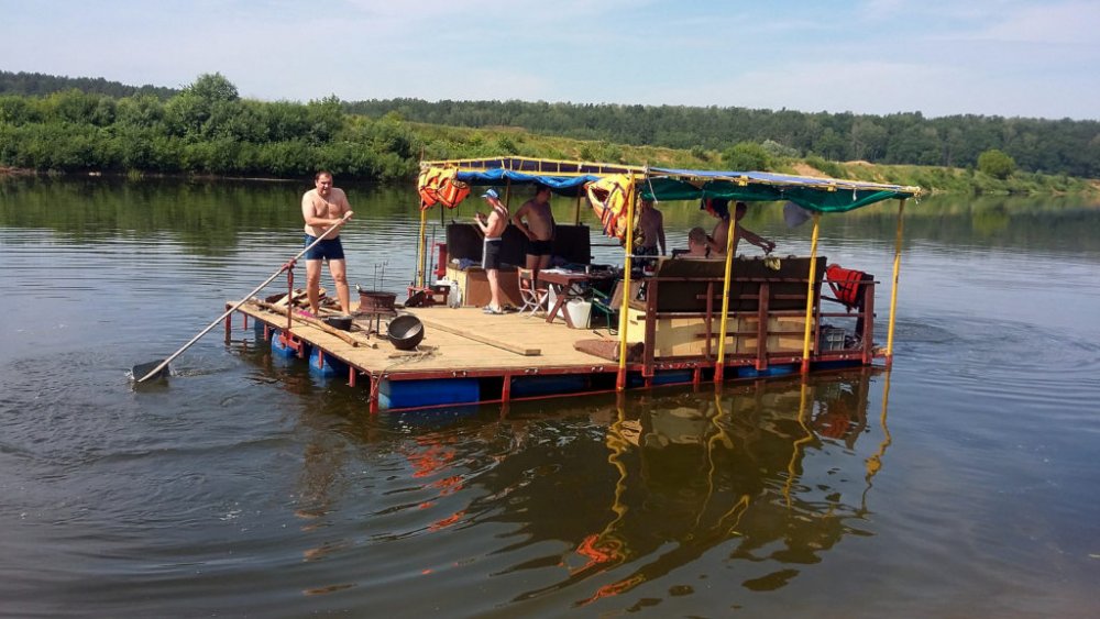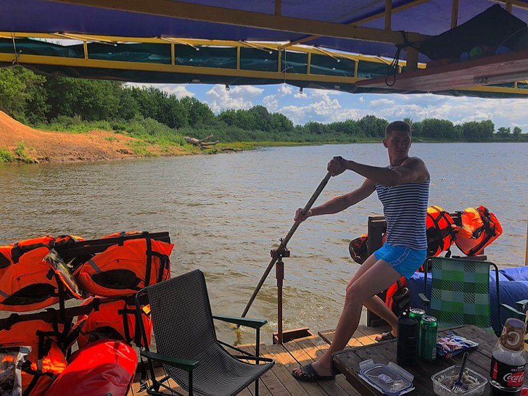 К вашим услугам плот «Резвый» на 10-12 человек. Плот для сплавов оборудован тентом и пологом, благодаря которым даже в дождливую погоду вам будет комфортно. Тент закрывает от солнца и дождя большую часть плота. В центральной части плота расположена кают-компания. В кают-компании предусмотрены места для хранения: скрыни и шкафчики. Там же – кухонная и столовая посуда. Плот для водных приключений оборудован мангалом, казаном, чайником, водой 60 л., дровами, топором, лопатой, жилетами, стульями, светом, USB-выходами для зарядки телефонов, колонкой. Также есть дополнительный кухонный стол. Его можно переносить с места на место. Мы обычно на день ставим стол рядом с мангалом, чтобы было удобнее готовить еду, вечером рядом с мангалом ставим стулья, чтобы посидеть у костра. Для того чтобы уберечь деревянную палубу от падающих головешек, мы установили мангал на металлическом листе.