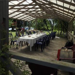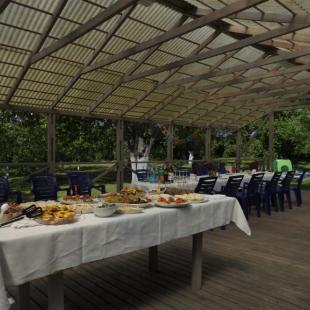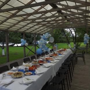 Также в усадьбе находится бескаркасная беседка (70 м2) для мероприятий. Беседка крытая, здесь имеется необходимая мебель, набор хрустальной и фарфоровой посуды. Для гостей может быть организовано питание, развлекательная программа.