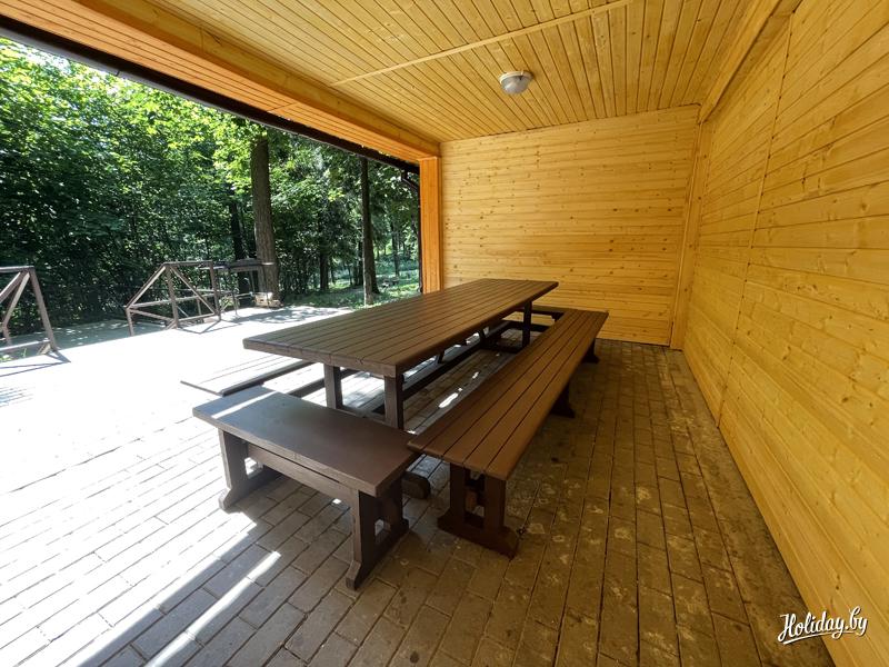 Организовать застолье мы предлагаем в уютной крытой беседке вместимостью до 15 человек. Беседка в аренду оборудована мангалом, предоставляются дрова. Также дополнительно есть розетки для подключения техники или зарядки мобильного телефона.