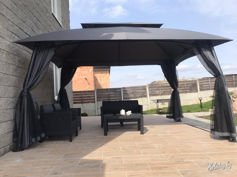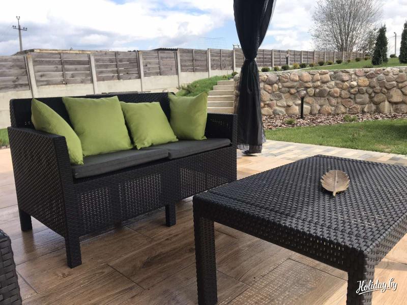Шатер в усадьбе Big House под Минском находится рядом с основным гостевым домом (если арендуете дом, то шатер включен в стоимость). Он укомплектован необходимой мебелью – столиками и уютными диванчиками с мягкими подушками. Возле шатра оборудована зона для приготовления барбекю. Гости усадьбы могут попариться в русской бане на дровах или познать все прелести японской купели Фурако (все за доп.плату). На благоустроенной территории будет, где разгуляться и маленьким гостям – резвиться на лужайке, прыгать на батуте, кататься на качелях.