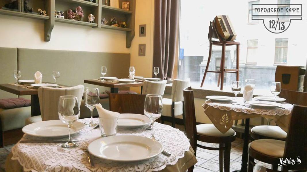 Кафе 12/13 находится в самом центре Минска на улице Володарского. Здесь можно приятно провести время с друзьями, послушать живую музыку и насладиться вкусной едой. В меню имеются блюда европейской, итальянской и белорусской кухни. Гости оценили "Цыпленка тапака", филе утки с соусом из красного вина, "Морковный" торт и "Медовик". В заведении действует обеденное меню с 11 до 16 часов по будням.
