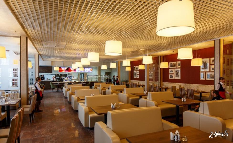 Интерьер кафе выполнен в нейтральных светлых оттенках.