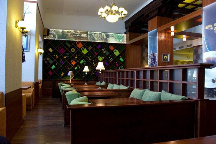 Оформление пространства отличается оригинальным цветовым решением, обилием декоративных элементов, цветов и черно-белых фотоснимков. Мебель расставлена с расчетом на комфорт посетителей и их желания: можно разместиться как большой компанией, так и отдохнуть в одиночестве, посвятив время чтению книги. Предметы интерьера для обновленной летней террасы были привезены из Италии.