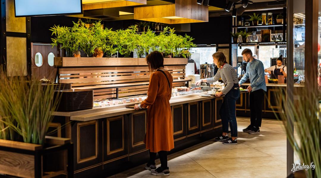 В кафе действует меню завтраков и комплексных обедов. Возможна организация деловых и праздничных мероприятий.