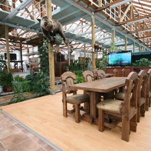 Для гостей работает кухня и собственный кондитерский цех. Меню предлагает самые разнообразные блюда национальной белорусской, русской и других кухонь мира. Все блюда готовятся из продуктов исключительного качества – это главное условие для продуктов у владельцев усадьбы. Варенье, приготовленное из плодов, выращенных в саду на территории усадьбы к чаю, и домашнее вино собственного приготовления восьми видов к романтическому ужину никого не оставят равнодушным! Прямо в кафе-оранжерее есть бассейн, где плавают осетры.