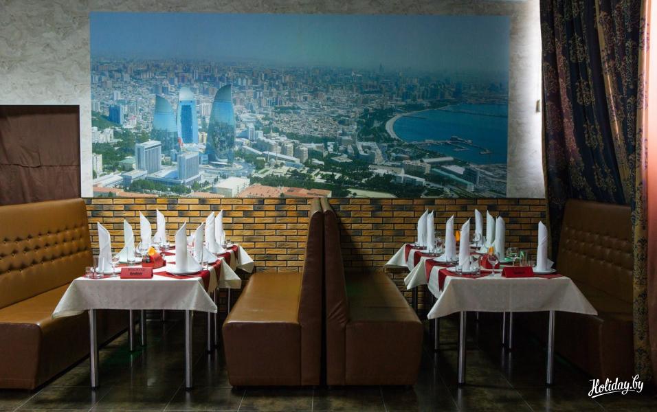 Кафе "Баку" -место для ценителей яркой кавказской кухни. Здесь готовят грузинские, азербайджанские блюда, а также классические блюда европейской кухни. Любимые блюда гостей заведения: ярпах долмасы в виноградных листьях, плов с коурмой, хачапури, садж, аджаб-сандал, ну и конечно шашлык. В кафе подают компот Bizim Tarla из фейхоа, сливы, айвы, который несомненно стоит попробовать гостям. Из алкогольных напитков здесь имеется широкий выбор коньяка, грузинского вина и пр.