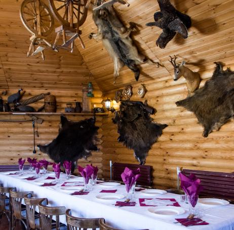 Гости могут расположиться в любом из четырёх банкетных залов или в отдельной отапливаемой беседке в стиле охотничьего домика.
