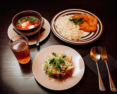В кафе вы можете заказать комплексный обед - с понедельника по пятницу с 12:00 до 16:00. Как правило, в комплексный обед входит салат, первое блюдо (супы, борщи, щи, рассольники, солянки), второе блюдо (гарнир + мясное или рыбное блюдо).