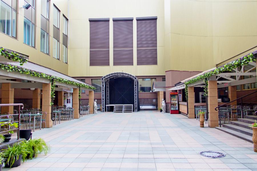 Летнее кафе представляет собой идеальное место для мероприятий, проводимых на открытом воздухе. Оно находится в центре Дворца и окружено со всех сторон высокими стенами, что даёт полную изолированность площадки от внешних шумов. Кафе оборудовано передвижной сценой и позволяет устанавливать световое и звуковое оборудование любой конфигурации. Столики для посетителей расположены под навесами, защищающими от непогоды, для удобства обслуживания клиентов есть барная стойка. В данном комплексе проводятся корпоративные вечера отдыха, концерты, фестивали, клубные вечеринки, видеотрансляции спортивных событий. Площадка рассчитана на 150 человек.