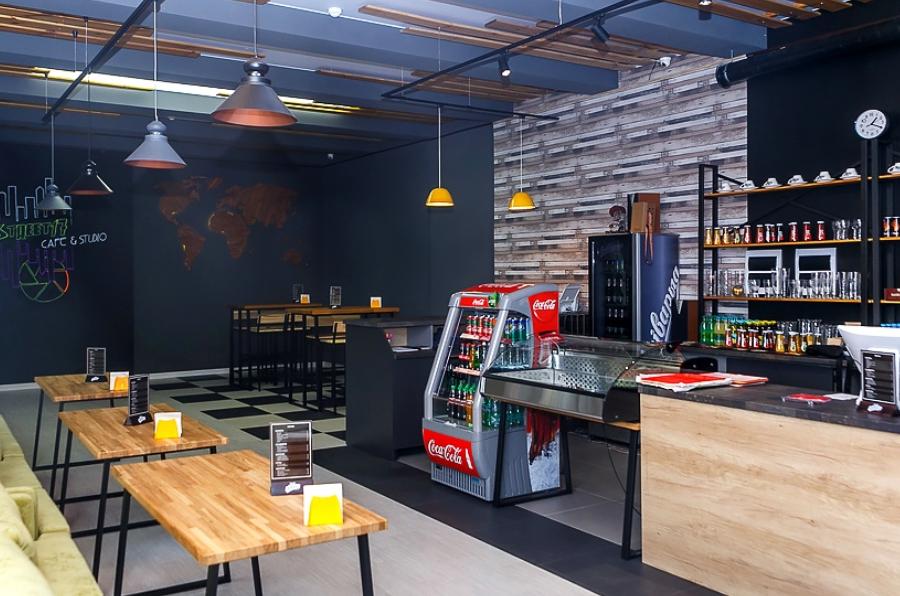 Интерьер в стиле лофт, гости могут расположиться на диванах или за столиками у окна.