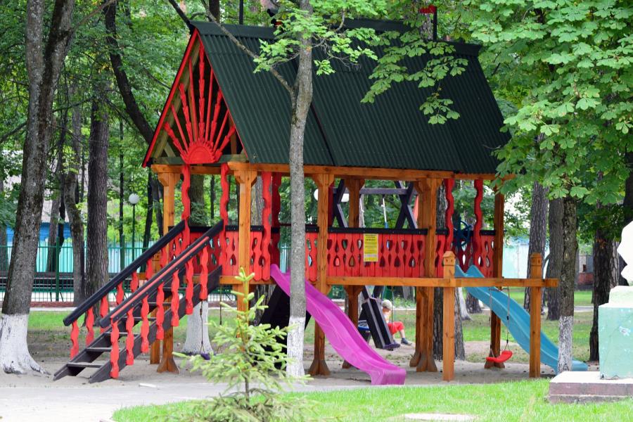 На территории лагеря имеется спортивно-игровой комплекс, который включает в себя металлические конструкции для развития силы и ловкости, футбольное поле, волейбольную площадку, площадки для бадминтона и баскетбола.