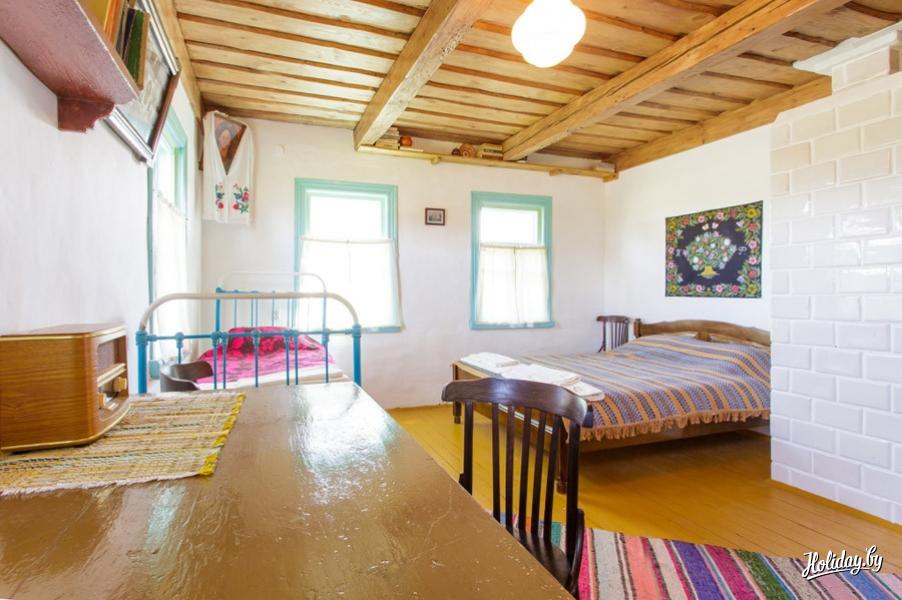 Дом рассчитан на семью из 4 человек, оснащен горячим водоснабжением, санузлом, печкой. Здесь вы найдете чистое постельное белье, полотенца, чайник, посуду. Вообще все дома туристического комплекса «Белые луга» отличаются аккуратностью и простором. Дышится здесь легко и свободно! Дом №12 выдержан в белорусской национальной стилистике, срублен из дерева, стены оштукатурены глиной. Все это создает особый уют. Так как дом деревянный, а все материалы внутри — натуральные, то в летний зной укрыться в таком доме — сплошное удовольствие. Он подарит спасительную прохладу, вы можете прилечь на деревянную кровать, устланную традиционным белорусским покрывалом, почитать книгу или просто помечтать и подумать о размеренности жизни наших предков. Но чтобы не заскучать и не замечтаться, когда жара спадет, отправляйтесь в лес или к пруду. Вы найдете огромное множество занятий, приносящих истинное удовольствие.